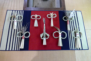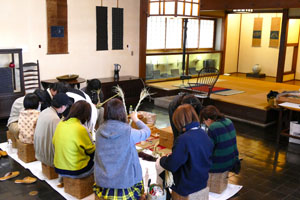 岡山で昔からお正月によく飾られている、めがね型のしめ縄(写真下)づくりを体験する。